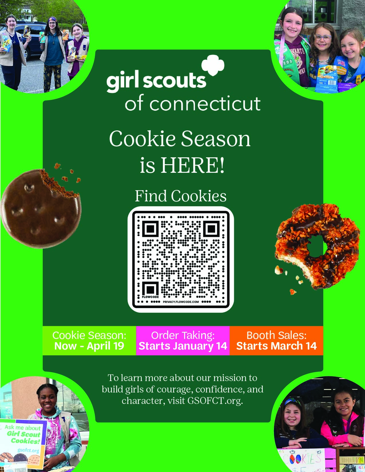 | Challenge #5 | 3/11–3/17 | Girl Scout Week (Carry the Torch) | Honor Juliette Gordon Low and the Girl Scout mission by showing how you are carrying her legacy forward through courage, confidence, and character. | Share one way you are “carrying the torch” this cookie season (helping others, leading, serving your community, or running your business with confidence). By March 17 at 11:59pm, submit a photo, short video, or reflection for a chance to receive 1 of 4 legacy patches and a GSOFCT sweatshirt. |