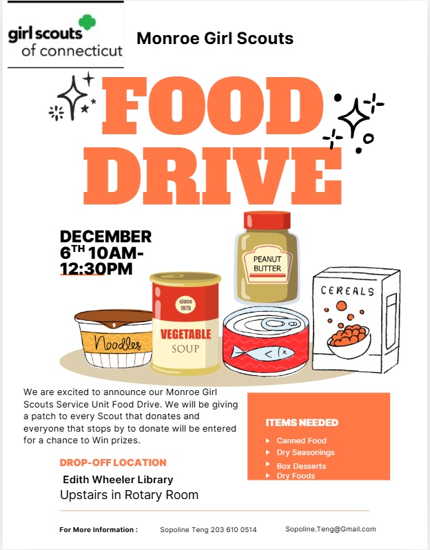 The Monroe Service Unit is keeping the momentum going with a Food Drive hosted by Cadette Troop 34010. Scheduled for December 6th at the Edith Wheeler Memorial Library, the event invites residents to drop off nonperishable food items. All donations will go directly to the Monroe Food Pantry.